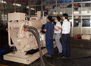 柴油机的基本结构:由气缸、活塞、气缸盖、进气门、排气门、活塞销、连杆、曲轴、轴承和飞轮等构件构成。柴油发电机的柴油机一般是单缸或多缸四行程的柴油机,下面我只说说单缸四行程柴油机的工作基本原理:柴油机起动是通过人力或其它动力转动柴油机曲轴使活塞在顶部密闭的气缸中作上下往复运动。活塞在运动中完成四个行程:进气行程、压缩行程、燃烧和作功(膨胀)行程及排气行程。当活塞由上向下运动时进气门打开,经空气滤清器过滤的新鲜空气进入气缸完成进气行程。活塞由下向上运动,进排气门都关闭,空气被压缩,温度和压力增高,完成压缩过程。活塞将要到达*顶点时,喷油器把经过滤的燃油以雾状喷入燃烧室中与高温高压的空气混合立即自行着火燃烧,形成的高压推动活塞向下作功,推动曲轴旋转,完成作功行程。作功行程完了后,活塞由下向上移动,排气门打开排气,完成排气行程。每个行程曲轴旋转半圈。经若干工作循环后,柴油机在飞轮的惯性下逐渐加速进入工作。